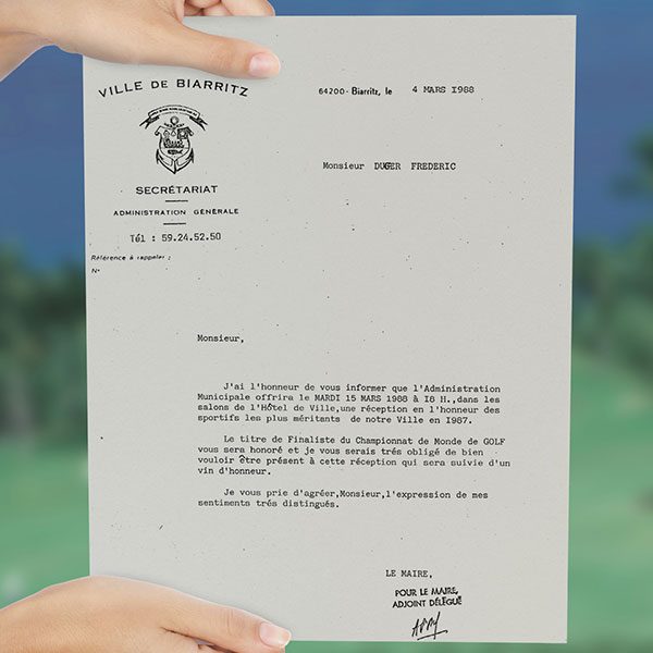 Le titre de Finaliste du Championnat de Monde de Golf vous sera honoré et je vous serais très obligé de bien vouloir être présent à cette réception qui sera suivie d’un vin d’honneur.